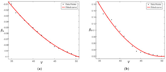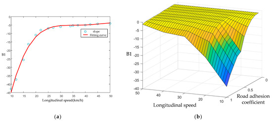 In the linear stability domain, in order to ensure the accuracy of the design boundary in the control process and the processing of data will not be too complicated. In this paper, linear expression is adopted. As shown in Figure 9a, it can be seen that the two lines are symmetric, with the origin as the center. The right line is and the left line is . The formula is as follows, and the Coefficient table of fitting function is shown in Table 3. The relationship between vehicle state and fitting coefficient is shown in Figure 10: