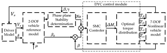 The front-wheel active steering system (AFS) and the direct yaw moment control system (DYC) are mainly used for vehicle yaw stability control strategies. The AFS uses the lateral force of the tires to generate additional yaw moments, and the system control function fails when the lateral force of the tires is saturated [33,34,35]. Therefore, in this paper, we use DYC to control the stability of the vehicle by using additional transverse moments.