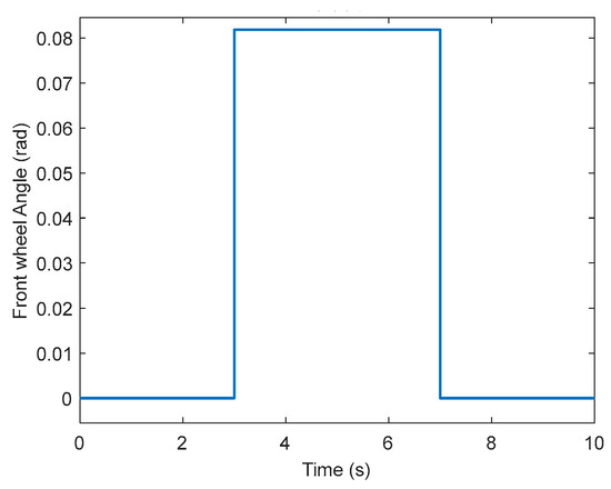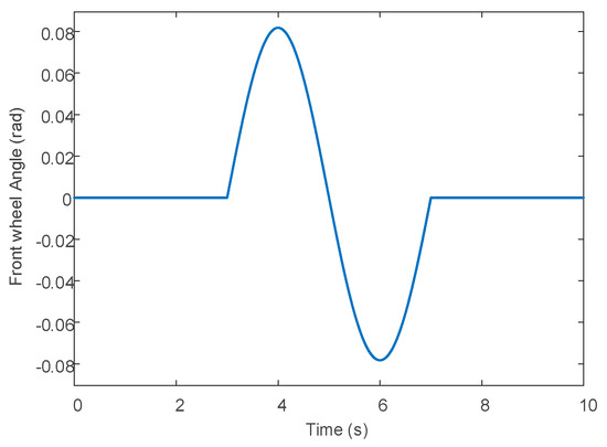 Set the front wheel angle as a sine input with an amplitude of 0.08 rad, as shown in Figure 13 The friction coefficient of the road surface is set at 0.4 to simulate the wet road surface. Longitudinal speed is set at 50 km/h.