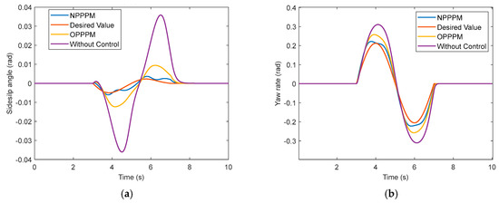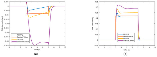 As can be seen from Figure 14, the wheel turning angle changes at 3 s. Before that, the vehicle keeps driving straight, and both the sideslip angle and the yaw rate can follow the ideal value. After 3 s, the actual state of the vehicle starts to deviate from the ideal value. The controller with NPPPM responded immediately after 3 s, indicating that the state of the vehicle was outside the stability domain of that phase plane at that time, the vehicle handling performance deteriorated, and the control system intervened, while the controller with OPPPM started to control only after about 3.3 s. It can be inferred that NPPPM can control the vehicle faster when the front wheel angle is changed. Moreover, we can see from the graph that the amplitude of the sideslip angle and yaw rate are 0.0079 (rad) and 0.0307 (rad/s) lower compared with those of the OPPPM method. In the maneuvering stability control system, the magnitude of the sideslip angle should be limited as much as possible to facilitate the stability control of the vehicle.