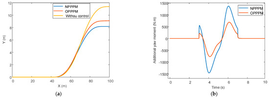 Figure 18 shows the simulation comparison of NPPPM and OPPPM under the same working conditions. Figure 18a shows that the lateral displacement of the trajectory based on the NPPPM control method is small, so the lateral control of the vehicle is slightly better than the OPPPM control method. Figure 18b shows the comparison of the additional yaw moment based on the lateral yaw angle error of the center of mass under the two division methods. The additional yaw moment under the NPPPM control method is higher than that under the OPPPM control method, which leaves less operating space for the driver and reduces the driver’s handling comfort to a certain extent but ensures the lateral stability performance of the vehicle under extreme working conditions. Under the NPPPM control method, the torque distribution trend of the same side wheel is the same, but the amplitude is different. Front-wheel torque is greater than rear-wheel torque because the vehicle is front-wheel steering. The phase trajectory based on the NPPPM control method can be closed, and the phase plane is closer to the origin than that under the OPPPM control method, and the area is smaller, which well reflects the superiority of this control method.