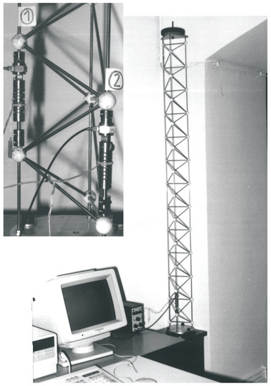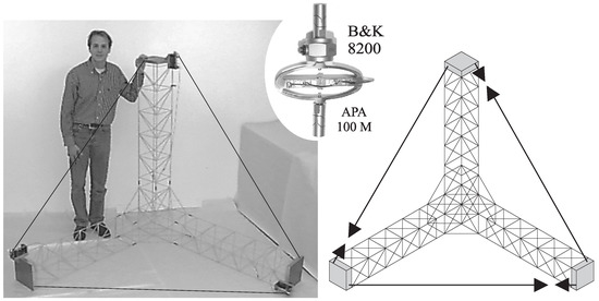 The above theory has been extended to guyed trusses and cable structures (Figure 8) [8,9,10,11], including suspension (pedestrian) bridges [12]. It was demonstrated that structures can be damped actively very efficiently with guy cables and, despite the simplifying assumption of the theory, the performances can be predicted with surprising accuracy from the results of two modal analyses, one including all of the cables (Figure 8 left), leading to the open-loop poles at the natural frequencies Ω i , and one in which all of the active cables have been removed (Figure 8 right), leading to the transmission zeros at the natural frequencies ω i (asymptotic values of the closed-loop poles when the control gain goes to infinity).