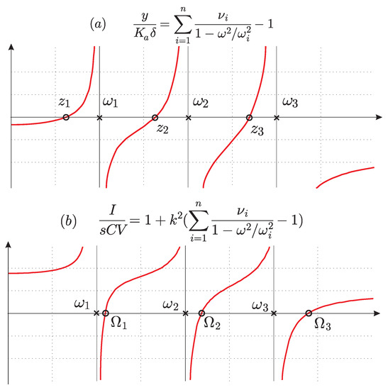 The second one is that between the voltage V and the current I in the transducer (it is used for damping the truss with shunted R and L elements, or in energy harvesting). Here again, we have alternating poles and zeros (Figure 4b); the poles are the natural frequencies ω i of the structure with shunted electrodes ( V = 0 ) and the zeros are the natural frequencies Ω i of the truss with open electrodes ( I = 0 ). All details are available in Section 4.9 of [6].