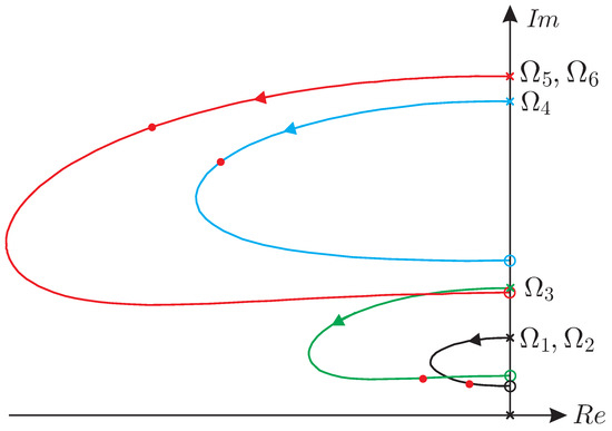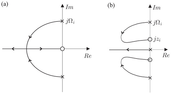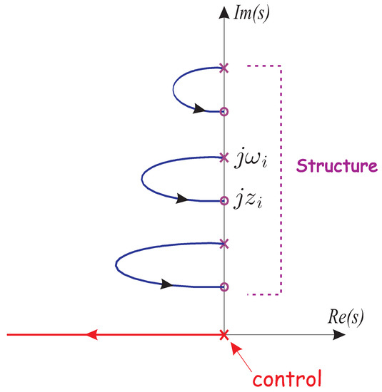 Indeed, Figure 6 shows the corresponding root locus plot showing the evolution of the closed-loop poles when the control gain g increases from zero to (only half of the plot is shown; it is symmetric with respect to the real axis). The closed-loop poles trajectories start from the open-loop poles ± j ω i and end at the transmission zeros ± j z i . For well separated modes, the individual loops in the root locus of Figure 6 are, to a large extent, independent of each other, and the root locus of a single mode can be drawn from the asymptotic values ± j ω i and ± j z i only: