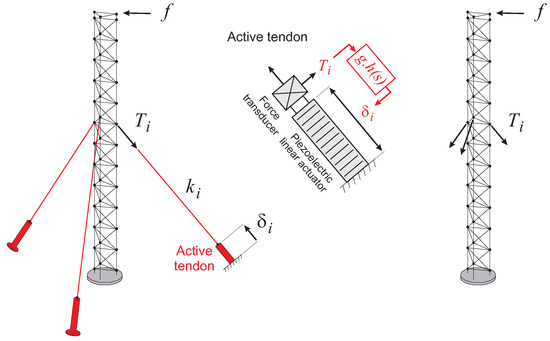 Figure 8. Left: Cable structure system with active tendons and decentralized control. Center: Active tendon with collocated actuator–sensor. Right: Passive structure. T i is the tension in the active cable i of axial stiffness k i and free active displacement δ i .