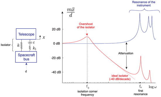 Space telescopes and precision payloads are subject to jitter due to the unbalanced masses of the attitude control reaction wheels or gyros. The performance of the instruments may be improved by inserting one or several isolators in the transmission path between the disturbance source and the payload. Referring to Figure 14, the vibration isolator always involves some amplification in the vicinity of its corner frequency, and attenuation at higher frequencies. Classical linear dampers (spring plus viscous damper) offer an attenuation of 20 dB/decade ( ω 1 ). In this section, we examine how a high-frequency attenuation of −40 dB/decade ( ω 2 ) can be achieved, actively, or passively. An attenuation of −40 dB/decade means that, at a frequency one decade larger than the corner frequency f 0 , the jitter is reduced 100 folds. Extremely sensitive payloads may even involve several isolation layers: The James Webb Space Telescope (JWST) involves two isolation layers, (i) the wheel isolator supporting six reaction wheels, with corner frequencies at 7 Hz for rocking and 12 Hz for translation and (ii) a 1 Hz passive isolator at the interface between the telescope deployment tower and the spacecraft bus [15]. In order to fully isolate two rigid bodies, one needs to consider the 6 degrees of freedom. For a number of space applications, it is convenient to integrate the six axes of isolation in a Gough–Stewart platform (Figure 15) in which every leg of the platform consists of a single-axis isolator, connected to the base plates by spherical joints.