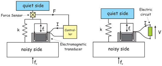 Figure 24. Comparison of the active isolator (left) with the passive isolator (right); if a R L electrical circuit is used, the passive isolator is a relaxation isolator; a purely resistive circuit produces a linear viscous isolator.