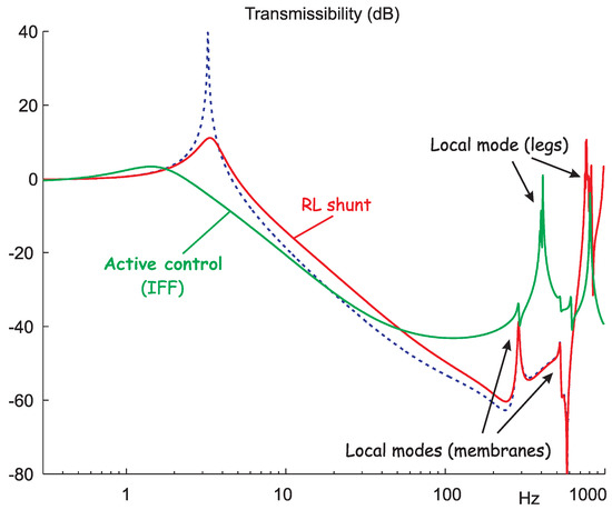 Figure 26. Vertical transmissibility of a six-axis isolator: comparison of the Open-loop (dotted line), closed-loop (IFF) active isolator, and passive relaxation isolator with a R L shunt (from [16]).