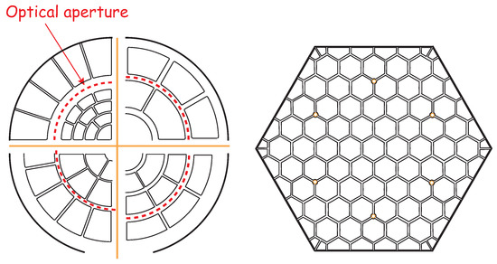 Figure 27. Most common electrode layouts of unimorph piezoelectric mirrors. Left: the Keystone layout is well-suited to controlling the low-order Zernike modes. Right: the honeycomb layout is homogeneous and well-suited to scaling up and segmented design.