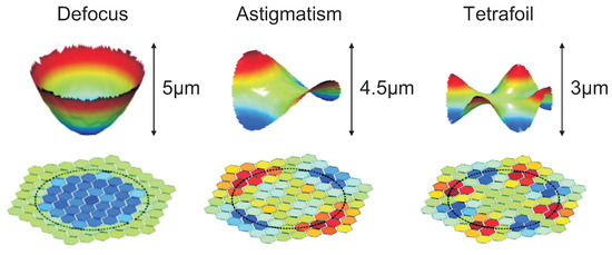 If the Jacobian is ill-conditioned, a Tikhonov regularization may be used in order to reduce the amplitudes of the voltages (see Ch.16 of [6]). Figure 27 shows the most common electrode layouts of unimorph piezoelectric AO mirrors. Figure 28 shows the experimental results of typical aberrations generated with a honeycomb layout and the corresponding voltage maps [22].