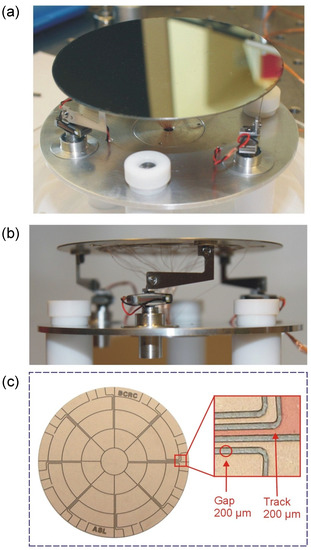 Figure 29. (a) Prototype AO mirror actuated with 25 electrodes in keystone configuration. (b) Detail of the isostatic mount with APA50XS actuators. (c) Keystone electrodes obtained by laser ablation.
