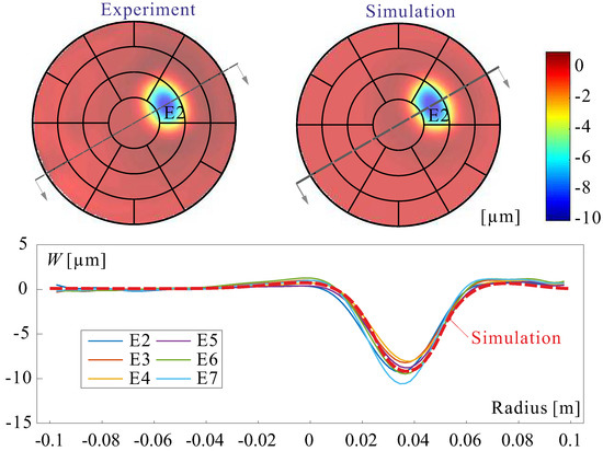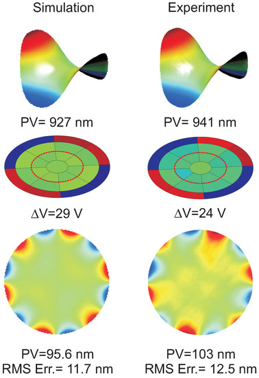 Figure 36 shows the experimental influence functions of six electrodes of the 200 mm demonstrator, for a voltage of 100 V. The figure also includes a comparison with a numerical simulation [27]. Once the influence functions are known, the Jacobian is easily constructed and Equation (15) can be applied to control the aberration.