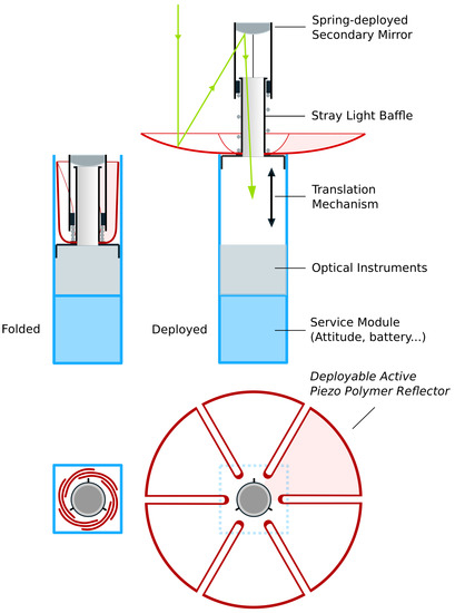 Flexible ultra-thin deployable reflectors are the subject of increasing interest because they combine a low areal density with the capability to deploy to sizes significantly larger than their stowed size, allowing a better resolution ( λ / D ) and a better signal quality ( D 2 ). This includes large sizes, which would not be possible with the current technology, even with deployable segmented optics similar to that of the James Webb Space Telescope (JWST has a primary mirror of 6.5 m), but also nanosatellites and CubeSats which are becoming increasingly popular for missions once carried out by much bigger satellites (e.g., [25]). Figure 32 shows a conceptual view of a deployable reflector with flexible petals in folded (left) and deployed (right) configurations. The deployment is achieved with a translation mechanism moving the reflector outside the CubeSat; the reflector, initially constrained inside the CubeSat is freed gradually as it moves upwards and the petals return elastically to their original spherical shape. A precise spherical shape will require some active control, which is achieved with a distributed layer of piezoelectric material at the back of the reflector.