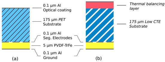 Figure 35. Layer configurations (a) unimorph used in MATS. (b) with thermal balancing and low CTE substrate.
