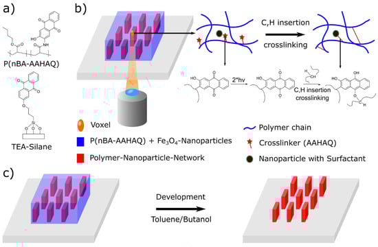 The material systems for the generation of the micro magnetic structures by 2-photon crosslinking processes consisted of superparamagnetic particles and a copolymer, which was composed of a matrix component and a photoreactive unit for crosslinking. As photoreactive group 2-amino-3-hydroxyanthraquinone (AAHAQ) developed by Schwärzle et al. was chosen, which exhibits pronounced 2-photon absorption due to its designed electronic structure (i.e., conjugated π-system, planarity, donor and acceptor groups) []. Briefly, the photoreactive group AAHAQ was obtained in a one-step synthesis from 2-amino-3-hydroxyanthraquinone and acrylic acid chloride. The desired P(nBA-AAHAQ) copolymer (see Figure 1a) was prepared by free radical polymerization of N-buylacrylate (nBA) and AAHAQ at 30 °C using a low-temperature initiator (2,2′-azobis(4-methoxy-2,4-dimethylvaleronitrile (V70).