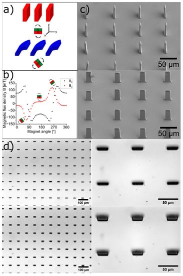 To characterize the movement of micro-actuators written with the 2PC process, simple beam structures were investigated. A 20× water immersion objective with 0.7 NA was used for writing the micro-actuators. The writing parameters chosen for this material were a laser power of 15 mW, a writing speed of 100 mm/s, a hatching distance of 0.15 µm and a slicing distance of 0.5 µm. These parameters were used for all experiments described in this paper. Figure 2a shows a schematic representation of the deflection of the micro-actuators. A permanent magnet (N42) was rotated with a speed of 30 rpm under the micro-actuators, which responded to the gradient of the field lines. The magnetic flux density B in the y- and z-directions at the actuator position as a function of the rotation angle is shown in Figure 2b. The micro-actuators experienced a maximum magnetic flux density of 130 mT, which led to the desired deflection of the beams. Figure 2d shows the resulting deflection of the beams under investigation. The actuators not deflected are shown in the upper part of the figure, and the maximum deflected actuators are shown in the lower part of the figure. The beams shown here were printed with a width of 20 µm, a thickness of 3 µm and a height of 70 µm. In ethanol, the micro-actuators swelled by a factor of 1.2 but remained firmly attached to the substrate as they were covalently bound there. The actuator fields were practically free of defects, illustrating the high reproducibility of this manufacturing technique. Figure 2c shows scanning electron microscope images that demonstrate the high resolution of the beam structures. As the specimens dried, they de-swelled, causing a slight decrease in volume. The drying process was also the reason for the slight rounding of the structures at the edges.