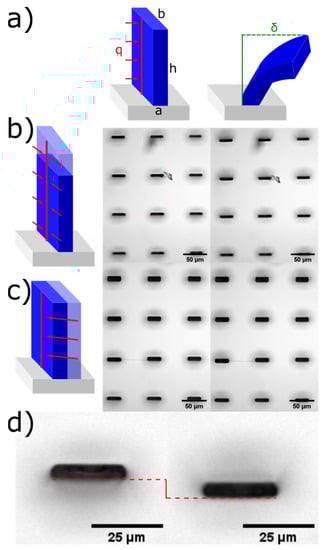 2PC allows for a rather simple variation of the actuator dimensions or aspect ratios. We have investigated the latter and compared our results to simple theoretical predictions using the Euler–Bernoulli beam theory []. The written beams have one end fixed to the surface and one free end. By neglecting the torsional motions, a simple cantilever model can be used. Since the nanoparticles are homogeneously distributed in the beam, a uniformly distributed volume load can be assumed. For simplification, this volume load is projected onto a line load q, which is shown schematically in Figure 3a. Thus, the model used now corresponds to a cantilever with a uniformly distributed load. The aim is to determine the maximum deflection at the free end of the beam as a function of the beam structure, i.e., the beam height. An expression for the maximum deflection of the beam can be obtained by integrating twice the ordinary differential equation of the deflection curve. Here, it is assumed that the system is in the linear elastic range (Hooke’s law) and the equation is therefore only valid for small deflections. For the maximum deflection δ of the beam the following formula is obtained: