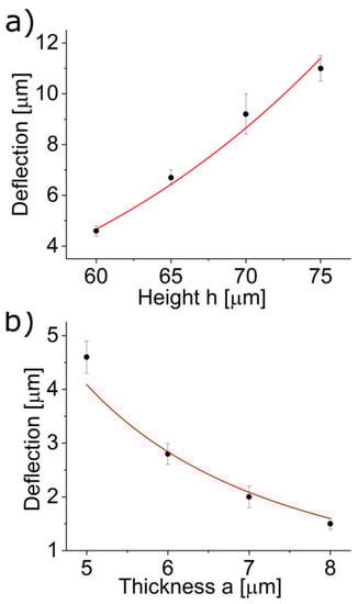 To verify the results obtained from beam theory, the deflections were determined using light microscopy images (Figure 3b,c). For better visualisation of the actuation, Figure 3c shows a zoomed-in image of the deflection of a beam with a height of 65 µm; in the supporting information videos of the actuation process are shown in Figure 3b,c. (Movies S1 and S2). The obtained deflections were plotted against the respective height h or thickness a. These were then fitted as functions of h and a. Figure 4 shows the fit curves obtained. A good agreement between the measured deflections and the calculated dependencies (solid lines) can be seen. Even for larger deflections in the range of 10 µm (>10% of the height of the structure), the measured deflection agreed well with theory, demonstrating that the simple beam theory is suitable to describe the deflection behavior.