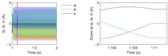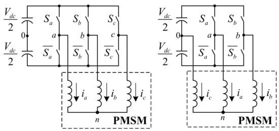 The reconfiguration between the 6S3P and 4S3P topology is accomplished by the Pfault switch (see Figure 3), which is controlled by the fault diagnosis module described in the following sections. Furthermore, after hardware reconfiguration from 6S3P to 4S3P, the SVPWM (space vector pulse width modulation) switching method must be modified for proper operation [32,33] in the new topology. Other parts of the control system remain unchanged. However, the number of available voltage vectors is reduced. The parameters of the current controllers R(iq), R(id), and the speed controller R(ω) are unchanged. Empirical tests conducted in a previous research phase confirm that only a modification of the SVPWM is required when the topology is changed to 4S3P after a single-phase fault.