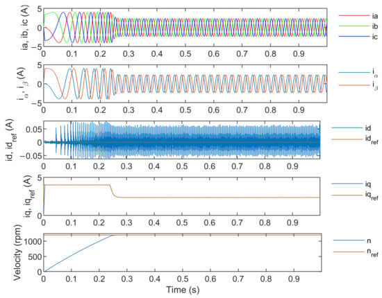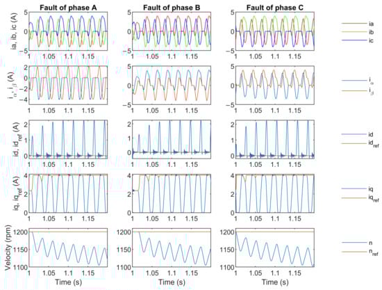 A simulation model of the controller and hardware was created based on the laboratory setup. The inverter model and SVPWM were designed using the MathWorks Simscape Electrical™ tool. The healthy 6S3P inverter was simulated with a reference speed nref equal to 1200 rpm. The simulation time was set to 2 s with a sampling time of 5 μs. The velocity and current controllers on the q and d axes operate correctly as shown in Figure 4. The fault was simulated at a time equal to 1 s for each switch in the inverter. A total of six datasets were recorded for the fault of the upper and lower switches in each of phases A, B, and C. The data for the upper switches are shown in Figure 5. However, due to the 1 s time scale, only the long-term response of the system speed is easily visible. Therefore, the time zoom for the first 4000 samples after the fault is shown in Figure 6, where the shape of the currents can be observed.
