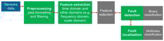 A data-driven fault diagnosis system can be developed with fault detection and fault localisation as shown in Figure 7. In this section, the focus is on fault detection, which means that it is only important to have information about the health of the system in one of two states: normal or abnormal. The normal state means that the system is working properly and that there are no symptoms to be concerned about. The abnormal state means that some symptoms of the system are outside of the range that is considered normal. The designed system needs to recognize these two states. This problem can be solved by performing a binary classification with the class labels of “normal” and “fault”. The first stage of preparation for the binary classification is data collection for each class and features extraction in the desired time, frequency, or time–frequency domain.
