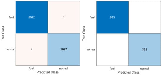 In the current research, data were collected from the currents in phases A, B, and C. These data were divided into a time domain window of 128 samples (Figure 8). Six time domain features were extracted for each current in the window: the standard deviation, variance, median, minimum, maximum, and peak-to-peak. Three frequency-domain features were also extracted: the maximum magnitude frequency component index, minimum magnitude frequency component index, and peak-to-peak frequency magnitude. In total, 27 features were used to train the classification to detect the “normal” or “fault” class. A single-switch fault was considered for each switch in the 6S3P topology. At the current stage of research, 11934 observations were used in the training process and 1325 observations were used in the test. The observation time window had 12 samples overlapping with the previous time window. Training was performed in MathWorks Matlab R2022b using the Statistics and Machine Learning Toolbox version 12.4. More than 16 classifiers with different structures (i.e., linear discriminant; SVM—support vector machine; KNN—k-nearest neighbours; narrow neural network; decision tree; bagged tree) were trained, with a test accuracy of greater than 99% for the selected features (Figure 9).