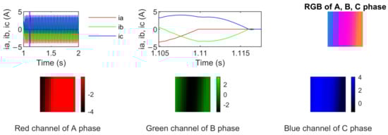 At the current stage of the research, the time domain signal is transformed into an image. The dataset prepared for each class was used to train a CNN (convolutional neural network). The single RGB image consists of three channels: red, green, and blue. The data collection was studied in time window equal to 256 samples, which results in an image size of 16 × 16 pixels. In this approach, the time domain signal was converted into an image with a size of 16 × 16 × 3 (Figure 10), where red, green, and blue colours represent the current in phase A, current in phase B, and current in phase C, respectively. The time domain data of the 256 samples of a single phase are transformed into a 16 × 16 matrix, which is treated as an image. The image columns contain the consecutive samples of the signal. Example images at the same observation time for each phase are shown in Figure 11. There were 618 RGB images for each class, which provided a total of 1854 images. The time window of a single observation had 64 samples overlapping with the previous time window. All images were divided into training, validation, and test sets.