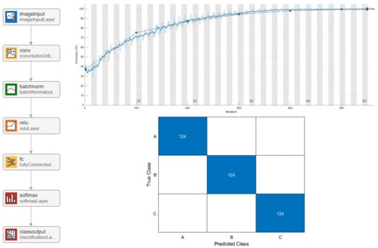 The three-label classifier (‘A’, ‘B’, and ‘C’) was designed as a convolutional neural network (CNN). An essential part of the design process is the selection of a CNN structure capable of RGB image recognition. At the current stage of the research, the CNN consists of seven layers (Figure 12 [left]): (1) an image input with a size of 16 × 16 × 3; (2) a 2D convolution of 8 × 8 × 3 convolutions; (3) a batch normalization with 20 channels; (4) ReLU; (5) three fully connected layers; (6) softmax; and (7) a classification output with class ‘A’, ‘B’, and ‘C’. The CNN training was performed in MathWorks Matlab R2022b using Deep Learning Toolbox version 14.5. The training result is shown in Figure 12 (bottom right). The total number of trained parameters in the CNN is 8763. The test accuracy was 100% for the test dataset.
