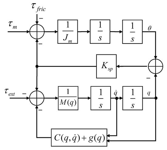 where denotes the inertia matrix, denotes the centripetal and Coriolis matrix and denotes the gravity vector. and q are, respectively, the motor and link angles. and are the external torque applied to the robot link and the torque applied by the elastic-joint deformation, respectively. and denotes motor torque acting on the motor inertia and friction torque. denotes the Hooke coefficient of the torsion spring in the joint of the series elastic actuator.