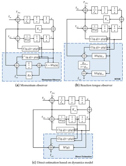 Photoelectric encoders are installed at both ends of the serial elastic driver (motor side and link side) to collect position information, so the driving torque of the link can be calculated by the deformation of the torsion spring. In this paper, three external force/torque estimation methods are used for comparison. The first method observes the real-time change of the robot’s momentum, as shown in Figure 4a. The second method observes the reaction torque, as shown in Figure 4b, which is mainly obtained by observing the driving torque and angular velocity, which avoids the requirement of angular acceleration in the dynamic equation. The third method is direct estimation based on the dynamics model.