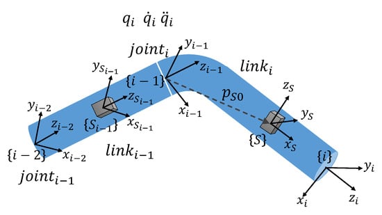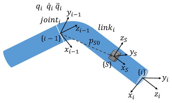 Furthermore, taking the derivative of Equation (11), the linear acceleration of the sensor caused by the rotation of joint i can be expressed as