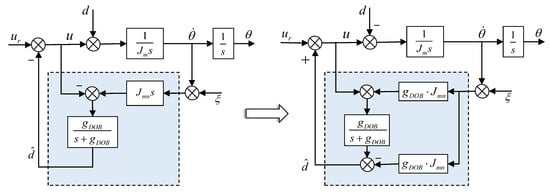 Due to considerable uncertainty in the dynamic model obtained by motor-side identification, feedback control based on the disturbance observer is adopted [26]. The purpose of applying it to the motor side of the elastic-joint robot is to compensate for the model uncertainty and motor friction disturbances caused by inaccurate identification, as shown in Figure 8.