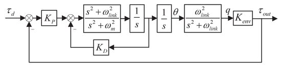 As shown in Figure 9, resonant proportional feedback control is used for the system with added spring feedback gain. At the same time, the interaction between the link and the environment is modeled as a spring with stiffness . Adjusting the resonance proportional gain to change the proportional relationship between the resonance frequency and the anti-resonance frequency is helpful to configure the poles of the closed-loop feedback control system. and are the proportional gain and differential gain, respectively. By selecting the appropriate control gain, the controller can be adjusted to make the system meet the design system performance index.