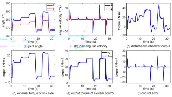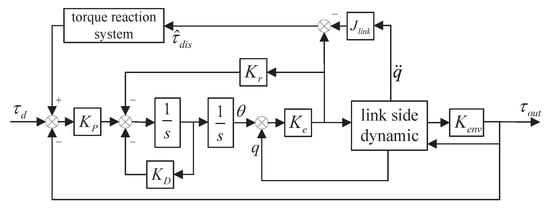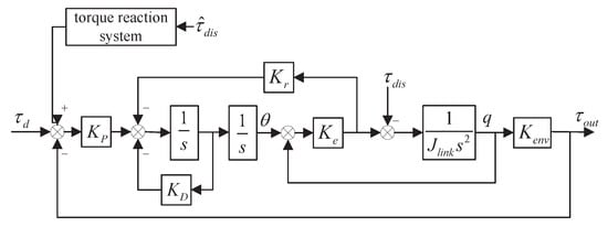 Therefore, the form of the force reaction system is Formula (32). The other forces on the link side, except the inertial force, are regarded as disturbances, and the disturbances are estimated as the input of the force reaction system. The influence of the nonlinear torque disturbance on the link side can be compensated for by superimposing the output result into the reference input torque. It is worth noting that both the gravity on the link side and the moments interacting with the environment are included in . This process realizes the compensation of gravity and environmental force. Estimates of disturbance torques are obtained using the model-based direct estimation method of external forces in Section 3. The complete system control structure is shown in Figure 11.