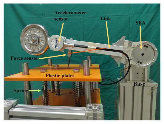 To facilitate the comparison of different performances of external force estimation, series elastic actuators are used as the single-DOF robot driving joints, as shown in Figure 12. The spring stiffness is 280 N·m/rad, And SEA system parameters are shown in Table 1. In the experiment, a 13-bit photoelectric encoder is installed on the motor side to collect motor position information for motor control; a 16-bit photoelectric encoder is installed on the link side to manage the position information of the link. This is a general configuration of a series elastic actuator. The angular acceleration of the link side is measured by directly mounting a three-dimensional accelerometer on the link side as an additional input for EKF data fusion; accelerometer parameters are shown in Table 2. Between the robot link and the external environment (spring plate), a force sensor is installed as an intermediate medium to directly measure the external moment acting on the link as a standard reference for estimating external forces by different methods; the force sensor parameters are shown in Table 3.