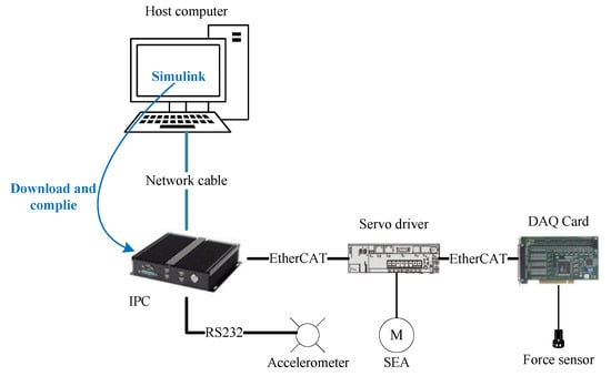 The control system platform is based on the Matlab/Simulink environment. The control system runs on the Simulink Real-Time operating system, and the basic structure is shown in Figure 13. It mainly includes a host computer, a target industrial computer, servo drivers, serial elastic driver, and other sensors. The development host computer runs on Windows and in the Matlab/Simulink environment; the target industrial computer is connected to the development host computer via the Ethernet. It runs the Simulink Real-Time system, and acts as the EtherCAT master station, connects to the motor servo amplifier and data acquisition card through the EtherCAT bus, realizes real-time state monitoring, feedback, and commands sent from the motor. In addition, the accelerometer data are connected to the target IPC through the RS-232 interface. The sampling time is 2 ms.