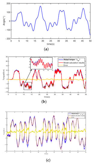Model validation results. (a) Trajectory; (b) Comparison of model output torque and actual torque (link side); (c) Comparison of model output torque and actual torque (motor side).