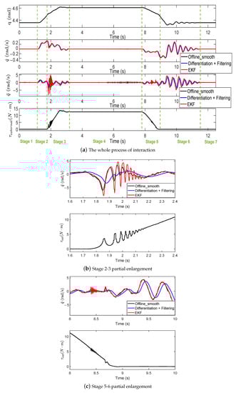 As shown in Figure 15, the state information of the link is recorded, including the angle, angular velocity, and angular acceleration of the link side. “EKF” represents the link status information calculated in real time by fusing sensor data using the EKF. “Differentiation + Filtering” represents the direct differencing and filtering of the position signals collected in real time on the control system. “Offline smooth” denotes the result of offline differencing and sliding window averaging of the joint link side angle signal returned by the photoelectric encoder. The mean smoothing of the signal leads to the loss of the high-frequency component of the state information, but does not cause a delay in the signal, and it is used for comparative reference of the robot system real-time status information.