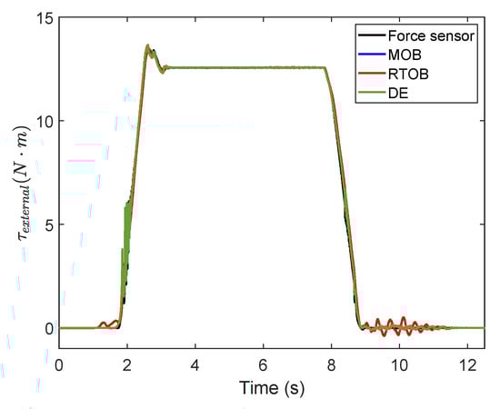 In the case of the MOB and the RTOB for external torque estimation, the angular velocity signal input to the observer is obtained by direct differential plus filtering of the position signal returned from the photoelectric encoder, because these two methods are proposed based on the unavailability of the angular acceleration signal. The model-based direct torque estimation method uses the angular acceleration signal estimated by EKF directly. The external force-estimation results of the three methods are shown in Figure 16. The outcomes measured by the force sensor are also displayed.