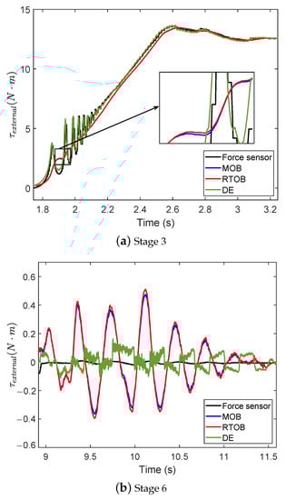 Among them, the most significant difference lies in stage 3 (pressing process), and stage 6 (free oscillation of the link), and the external force-estimation results of these two stages are displayed separately in Figure 17a,b. Stage 3 is the process in which the link presses the spring plate. The external torque acting on the link in this process changes rapidly and can reflect the following rapidity of the external torque estimation. Stage 6 is the free oscillating motion of the link caused by the joint flexibility after the link leaves the spring plate, in which the link is not subject to external torque and the external torque estimation result should be zero. It can be seen that the results of MOB and RTOB are the same. The reason for this is that the mathematical models of the two methods are essentially the same. The results obtained by both methods have a more pronounced delay compared to the reference value (measured directly by the force sensor), the external torque follows more slowly, and the presence of the system state delay leads to the detection of large external torque fluctuations even when the link is not subjected to external torque. However, the direct estimation method is characterized by high sensitivity and precision in external torque estimation.