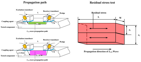 According to the principle of acoustic elasticity, the velocity of propagation sound is decreased by tensile residual stress and increased by compressive residual stress. By measuring the sound propagation time in the calibration area and the tested area, the measured stress can be achieved. In the actual test process, the measurement of residual stress at different depths can be achieved by changing the probe with different center frequencies. Liu et al. determined the relationship between the detection frequency and detection depth [