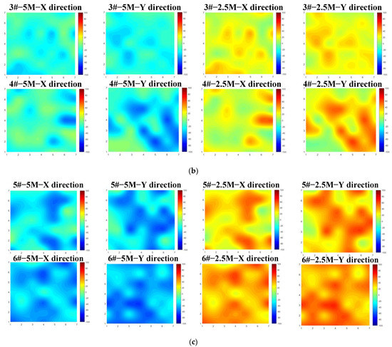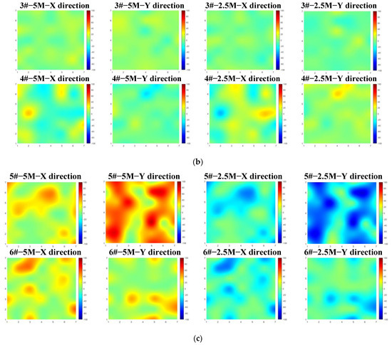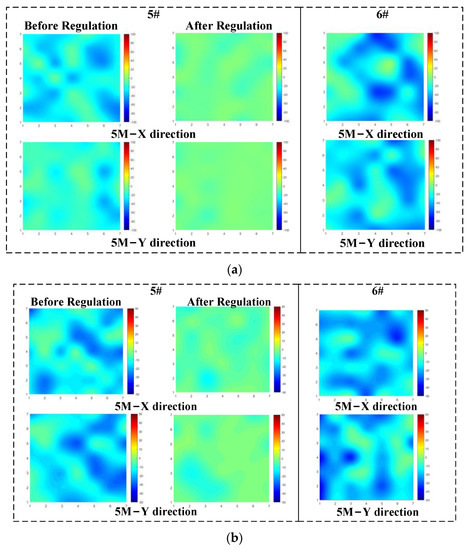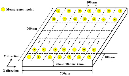 Figure 2, grids were divided and equally spaced on the surface of the plate, and residual stress was measured at the center of each grid. The rolling direction was set as the X direction and was perpendicular to the rolling direction, which was the Y direction. A total of 49 points were measured at each frequency. For quantitatively observing the flatness deformation of components after machining and stress reduction, a three-coordinate measurement is also required at the residual stress detection point to fit the flatness. The size measurement was carried out by the Global 9208 contact measuring instrument of Hexagon company.