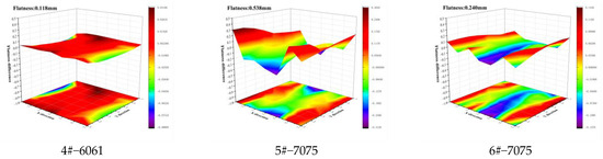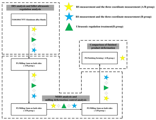 Two pieces of 5A06/6061/7075 aluminum alloy blanks were selected for the experimental study. 1#/2# are 5A06 plates, 3#/4# are 6061 plates, and 5#/6 # are 7075 plates. The milling materials were divided into group A (1#/3#/5#) and group B (2#/4#/6#). Group A is the comparison group, which is only the milling aluminum alloy plate. Group B is the control group, and its processing flow is the same as that of group A. An ultrasonic stress relief method was used to eliminate residual stress in the blank stage and after milling.