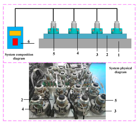 Figure 5. Firstly, an ultrasonic transducer was fixed at the node position by a fixed tooling and then combined with a vacuum suction cup so that the front end surface of the transducer is 1.5 mm higher than the bottom surface of the suction cup. Then, grease was applied. When the vacuum suction cup is placed on the regulated plane, the transducer moves upward so that the connecting spring on the fixing tooling is in a compressed state, thereby ensuring that the transducer front end is always closely attached to the plane. In the actual stress relief control, 16 sets of ultrasonic transducers were evenly arranged on the regulated plane. During the control process, the aluminum plate was placed in a constant-temperature air-conditioning room at 26 °C, and the piezoelectric ceramics were monitored by a laser thermometer, where the output amplitude of a single transducer is 10 µm (±2 µm). The transducer piezoelectric ceramic temperature increases with an increase in the working time. In order to ensure that the output power is not less than 60 W, the single processing time should not exceed 20 min in order to prevent the output power shortage caused by the high temperature of the piezoelectric ceramic. The regulation parameters are shown in