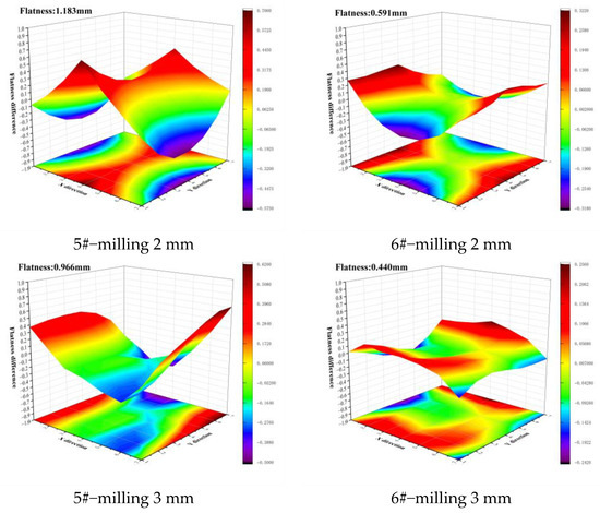 Table 2, respectively. Note that, in contrast to conventional milling, where a smaller residual stress distribution is desirable, here, in order to compare the effects of ultrasonic stress relief methods on deformation control, a lower milling speed and rotational speed were selected, and the milling path used reciprocating milling to introduce larger residual stress and deformation after milling.