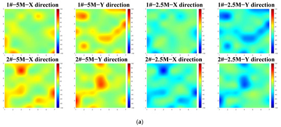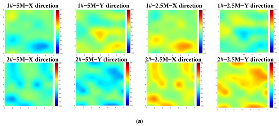 The distribution of the initial residual stress cloud diagram of the 1# to 6# aluminum alloy slab billet is shown in Figure 6. It can be clearly observed that all of the billets mainly have tensile residual stress in the 5 M detection depth range. In contrast, the rolling residual stress in the 2.5 M detection depth range is mainly compressive residual stress. The residual stress distribution along the rolling direction is very different from that perpendicular to the rolling direction, but the overall stress level is comparable. Furthermore, in the X and Y directions, the residual stresses of 5 M and 2.5 M are almost symmetrically distributed; that is, the residual stress of the aluminum alloy blank formed by rolling is in a tensile–compression oscillating distribution along a certain depth, which is consistent with the measurement results of Huang and Li et al. [25,26]. The stress distribution inside the two blanks of the same material is also irregular, but there are stress concentration areas. In the range of the 5 M detection depth, both the 7075 aluminum plate and 5A06 aluminum plate show tensile residual stress. The maximum residual tensile stress of the 7075 aluminum plate is 85 MPa, followed by the 5A06 aluminum plate, which is 76 MPa. There are both tensile stress and compressive stress in the 6061 aluminum plate. The maximum tensile stress is 36 MPa and the maximum compressive stress is −32 MPa.