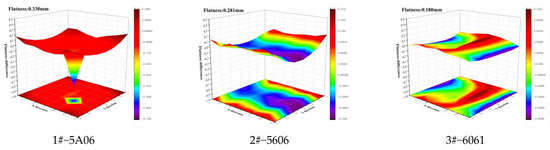 The deformation cloud diagram of the aluminum alloy blank plate after unilateral milling of 1 mm is shown in Figure 7. Regardless of belonging to group A or group B, the deformation of the 7075 plate is the largest, 5A06 is the second, and 6061 is the smallest, which is consistent with the distribution trend of IRS distribution. The deformation of the plate after stress relief is less than that of the plate directly milled. Among them, the 7075 plate shows a concave deformation trend after milling, and the two sides of the plate are warped upward. The flatness of the 5# plate milled directly is 0.538 mm, whereas the flatness of the 6# plate milled after ultrasonic stress relief is less than half of that, at 0.24 mm. The deformation trend of the 5A06 plate is the same as that of the 7075 plates, and the 6061 plate is convex after milling. The 1# and 2# flatness difference is 0.049 mm, and the 3# and 4# flatness difference is 0.062 mm. This may be because 7075 aluminum alloy has a large hardness and yield strength, which produces a large amount of residual stress after machining with the same milling parameters. The stress is rapidly released during the resting process after machining, so its deformation is the largest. In summary, the residual stress field of the blank has a great influence on the subsequent milling deformation, and the IRS can be controlled using the ultrasonic method to reduce the deformation of subsequent milling.