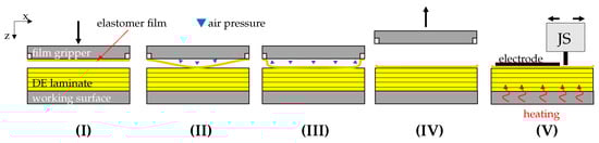 The fundamental process design for manufacturing dielectric elastomer transducers by laminating thin, pre-fabricated elastomer films is described in [45]. Besides sheet creation and separating the elastomer film from its liner, the main focus of this work concentrated on the crucial sub-processes of film placement and electrode application. Figure 1 schematically illustrates the sheet-to-sheet manufacturing approach. After a rectangular elastomer sheet is fixed at the edges by a gripper and the film liner removed, it is positioned above the working surface, on which a prefabricated laminate can be located. By applying air pressure, the film is transferred from the gripper to the surface below, whereupon a pressure rise presses the film against the surface from the center to the borders to displace air. After that, the gripper releases the film edges and moves up. Subsequently, a jetting system (JS) prints an electrode pattern on the elastomer surface. To reduce solvent-induced swelling, the working surface heats the DE-laminate, so the solvent vaporizes after the electrode ink makes contact with the elastomer surface. To increase number of layers, steps (I) to (V) are successively repeated. In the following, the dielectric layer generation by vertical film placement is investigated theoretically and the integrated electrode application process is presented.