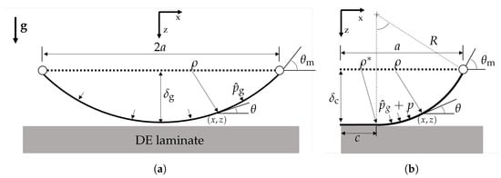 (a) Two-dimensional model of a clamped membrane in the initial state with initial length (dashed line) and its deformed contour (solid line) due to an equivalent pressure , representing gravitational volume force. (b) Membrane in no-slip contact with the underlying substrate (DE laminate) due to an added pressure p. The parameter c denotes the contact length, the coordinates right of the contact edge define an arc with radius R.