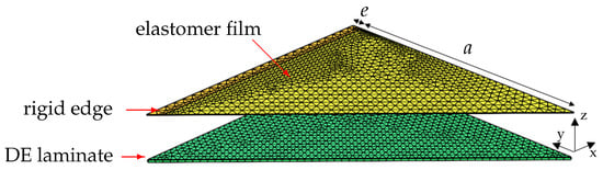 The FE-model represents an eighth part of the membrane, exploiting symmetry about yz-, xz- and the bisector plane. The elastomer film and DE laminate were modeled as neo-Hookean solid. In this investigation, the initial film thickness was exemplarily set to μm. The membrane edges with were rigidly fixed. A penalty contact with coupled adhesion was used to implement the no-slip condition between membrane and laminate surface. Gravitational volume force and additional pressure load were applied to the elastomer film. To improve convergence, the thin, compliant membrane was artificially stabilized by an additional spring foundation, increasing the effective membrane stiffness in the z-direction, while contact was calculated. Essential simulation parameters used in the study are summarized in Table A1. The simulation contained the following steps: